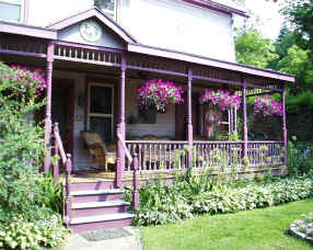The 1884 Mill House: Relax on the restored porches of the 1894 Mill House. They overlook many gardens and the Stone Grist Mill...